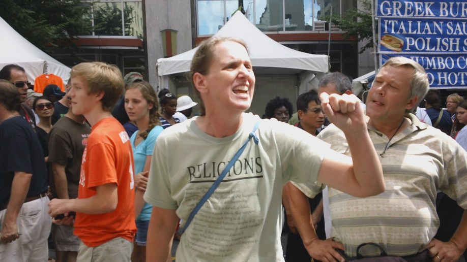 This lady had a pluralistic shirt on and chanted “God is love” over and over again during Shawn’s preaching (see video).
