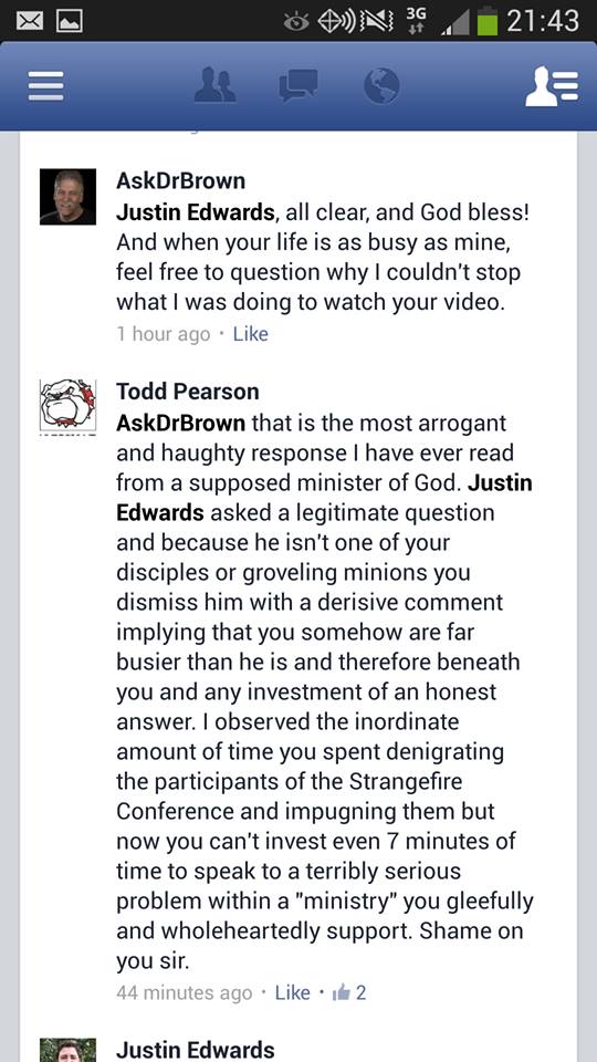 Dr. Brown, I can fully appreciate and respect the fact you are probably overwhelmed with a ministry like, “Ask Dr. Brown“, especially due to your campaign against the Strange Fire conference. Yet, it seems you would appreciate my questions and offer to get back to me when it’s convenient for you. After all, the motto of your TV show is, “Answering Your Toughest Questions“. One would think the toughest questions would include answering questions about your public ministry and affiliations, but that does not seem to be fair game? I digress.