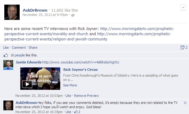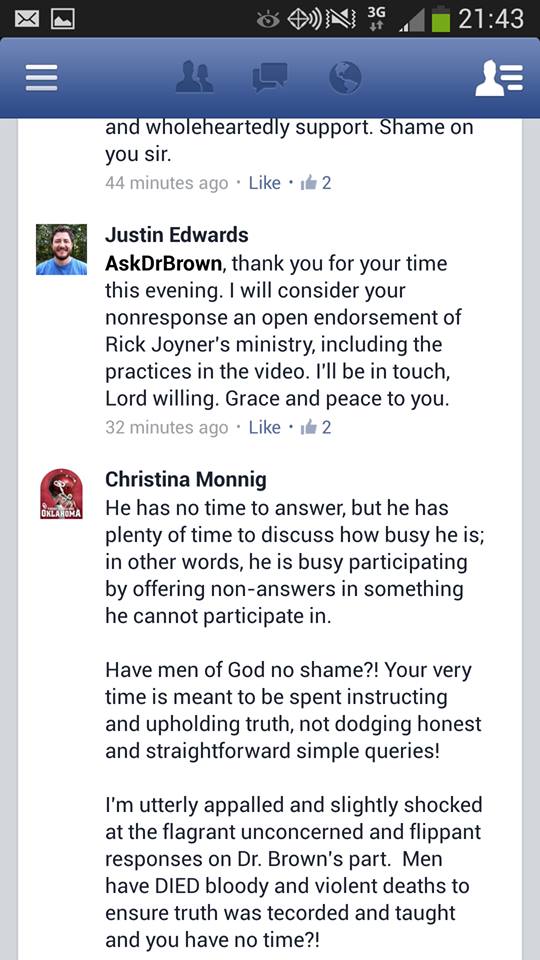 Now, Dr. Brown. I understand how some of the comments you received put you on the defensive. What baffles me, however, is that you drew a charge that if these are my friends, that is very telling of me. One is free to draw their own conclusions about that, but if these comments are telling of my friendships, then certainly we can use the same logic to conclude your friendship and ministry relationship with Rick Joyner to be telling of your ministry and commitment to the truth? Moreover, it is not so much your refusal to respond to my inquiries that concludes for me your open endorsement of Rick Joyner, but you have already endorsed his ministry, and your dismissal of my concerns gives further evidence of your open endorsement.