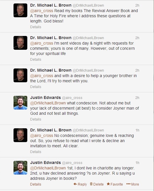 Dr. Brown, I did not ask my questions as one of your disciples, seeking to understand a question on theology or Christian worldview. I came to you as a concerned Berean, who has found your association with Rick Joyner et al troubling (to say the least). What I have attempted to find out is your true position, and hoped it may have been an oversight on your part not knowing some of the strange fires that are raging south of the border in South Carolina. It is becoming more clear that is not the case. I am left to conclude that you either